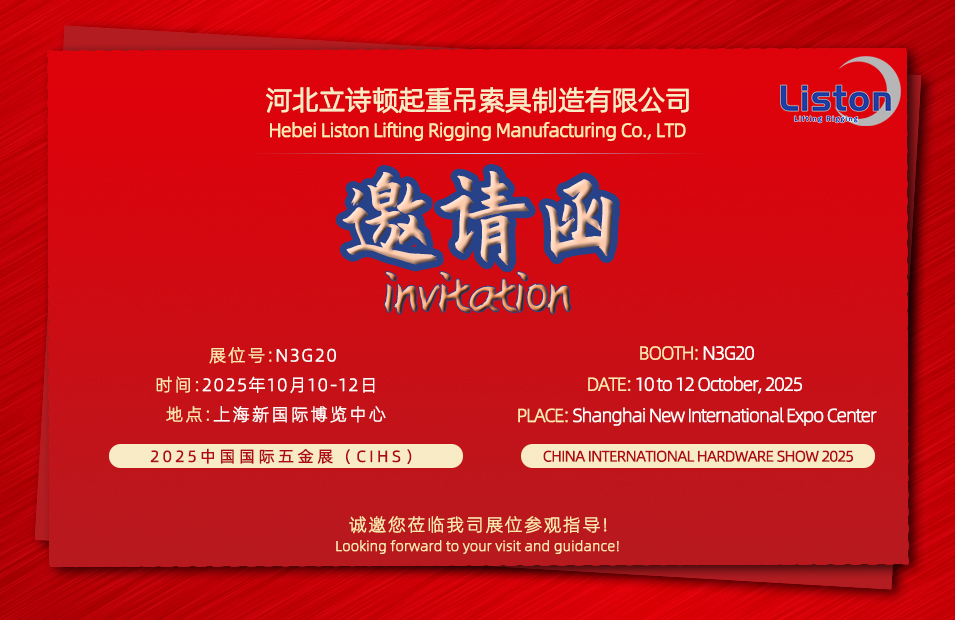 您好!值此起重装备行业升级之际,河北立诗顿起重吊索具制造有限公司诚挚邀请您莅临 2025 中国国际五金展(CIHS),共探行业趋势,共拓合作商机。